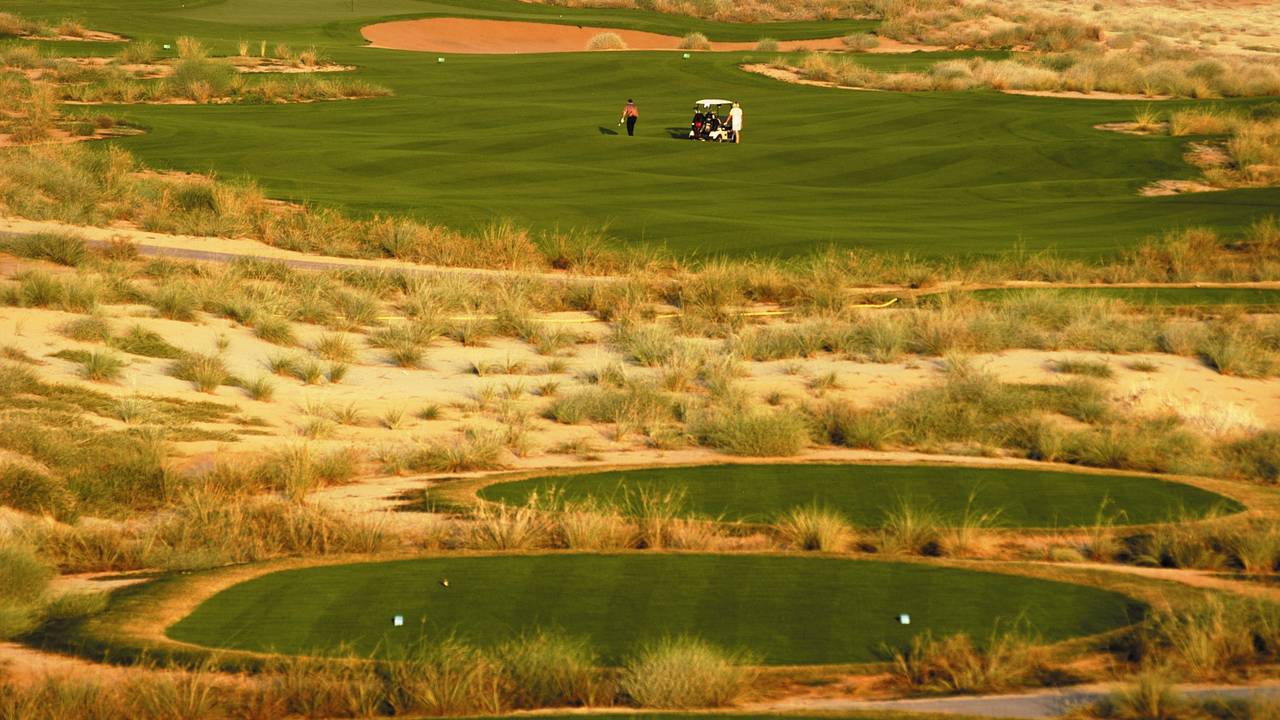 Exclusieve baan in woestijnlandschap. Baan volgt natuurlijke glooiingen, oogt als links course. Geen water of bunkers. Blijf op de smetteloze fairways, rough is voornamelijk zand en struiken.Golfbaan is inclusief buggy.