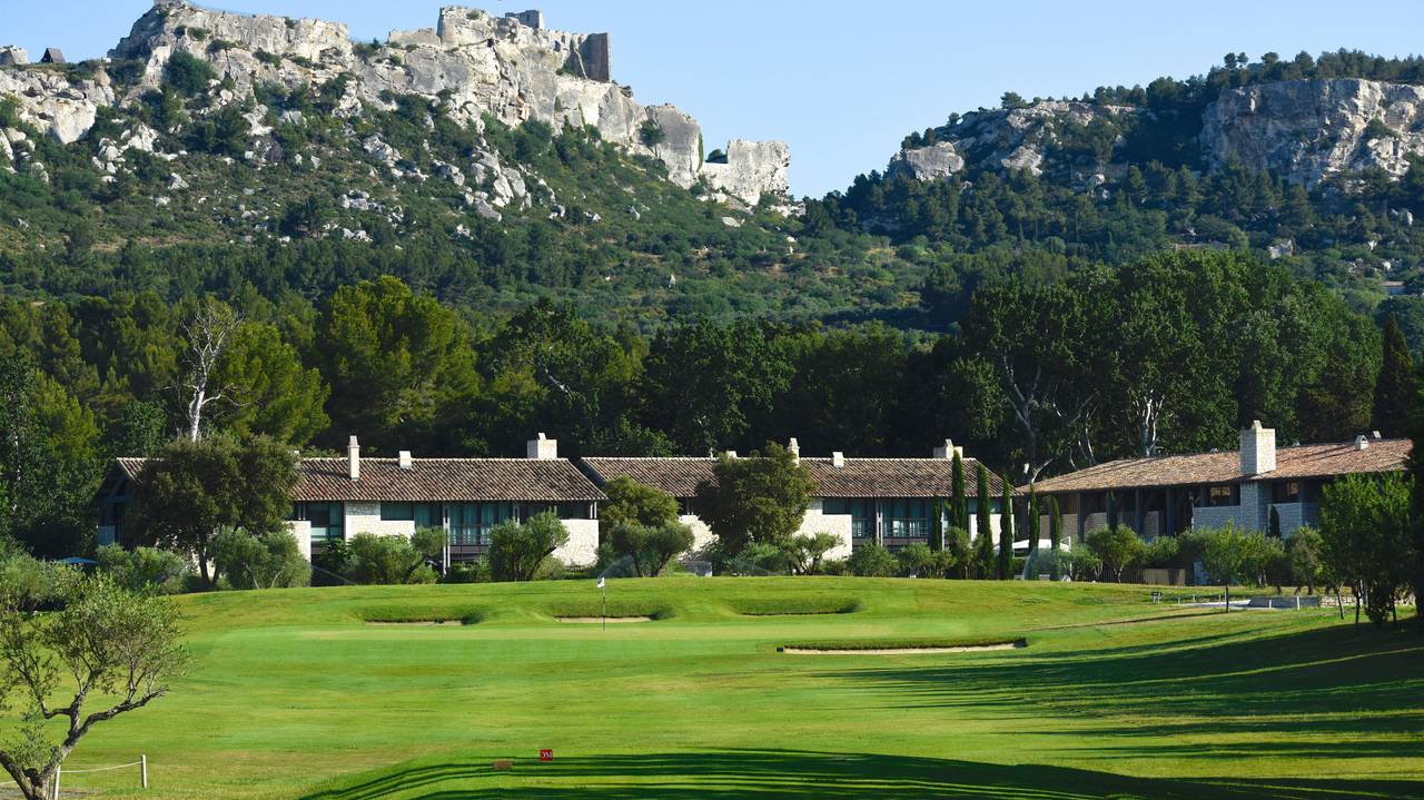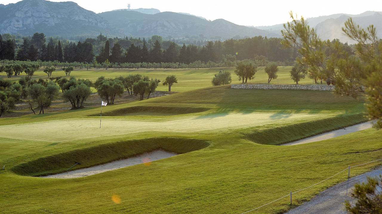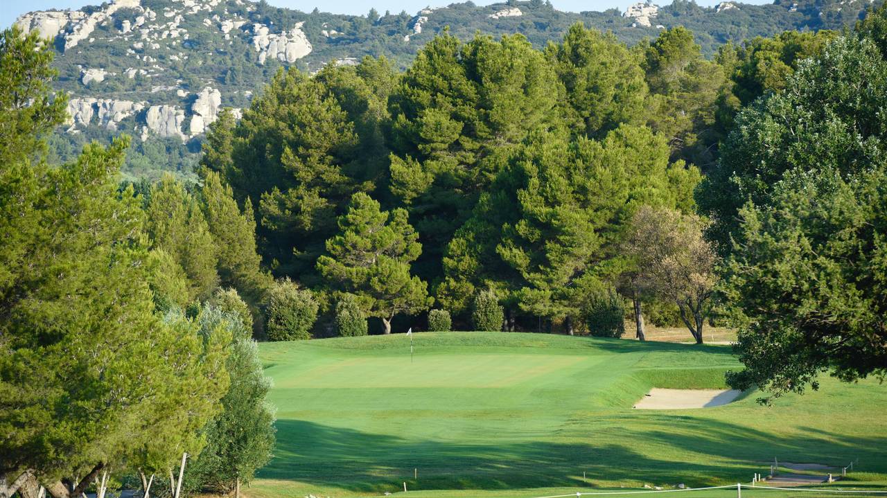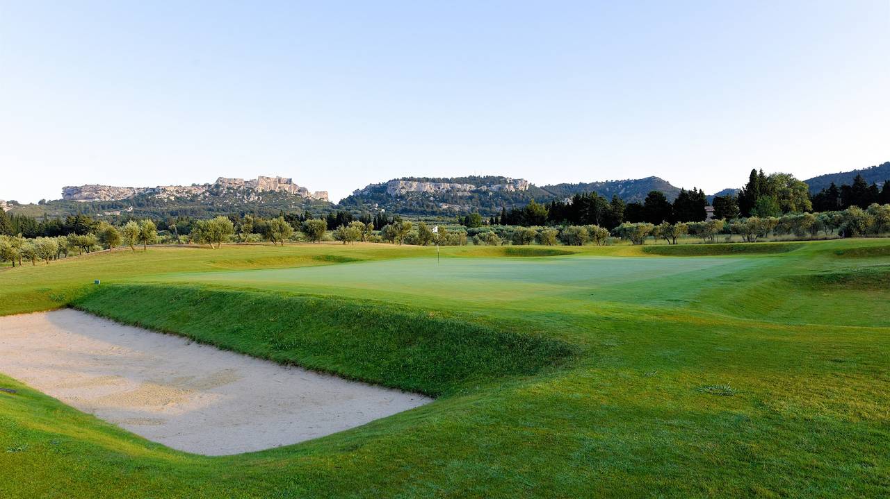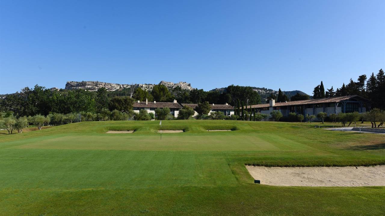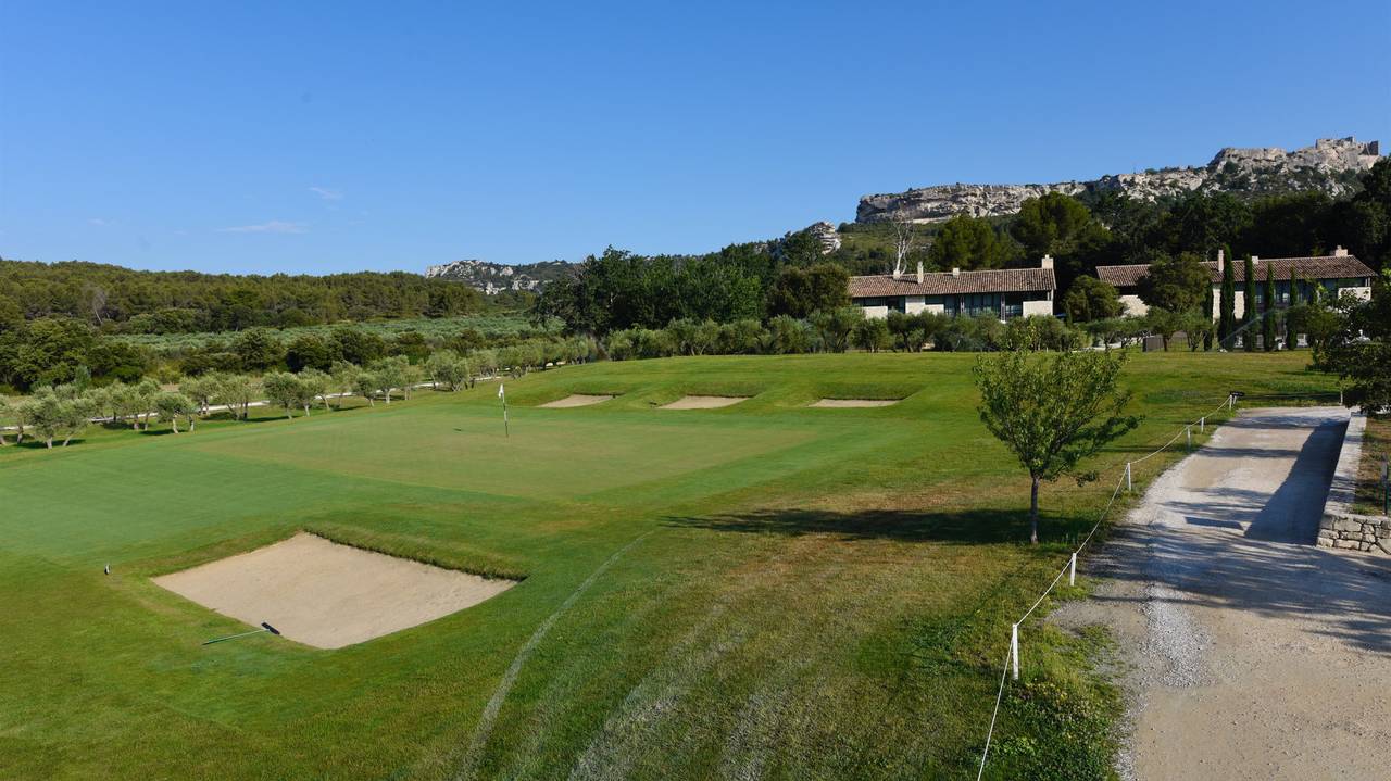 Ingebed in de rotsachtige omgeving van Les Baux. De baan maakt deel uit van het landschap en is omringd door dennen, eiken en olijfbomen. De uitzichten op de Alpilles zijn werkelijk prachtig.