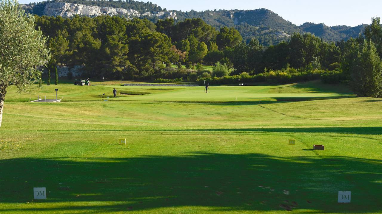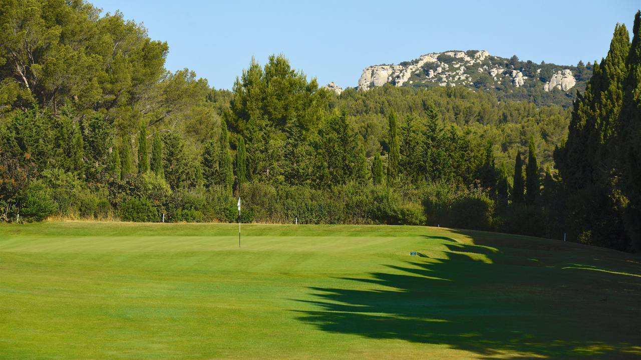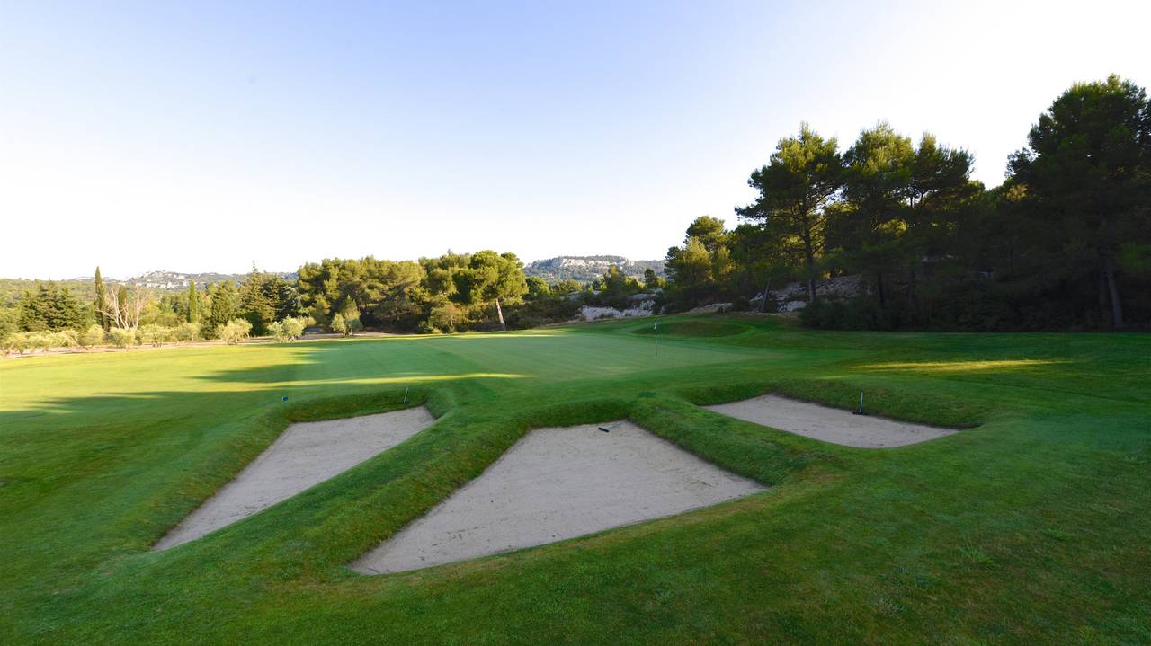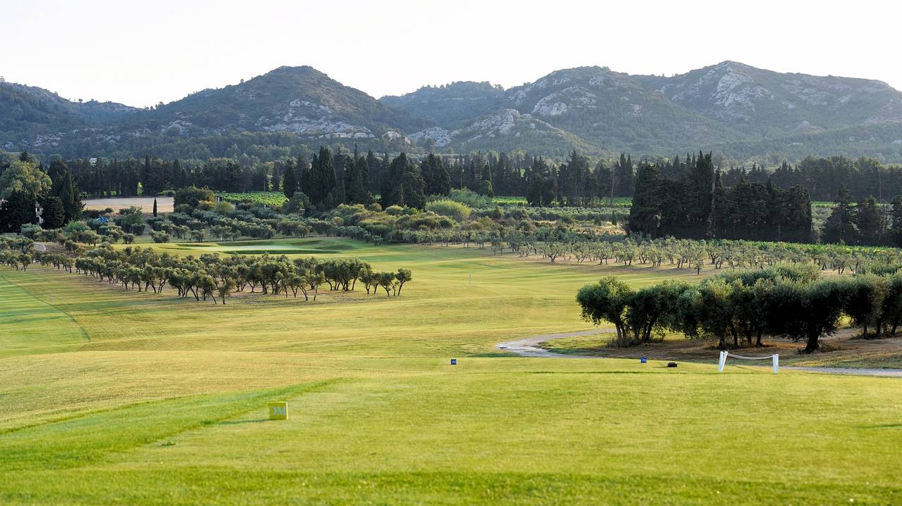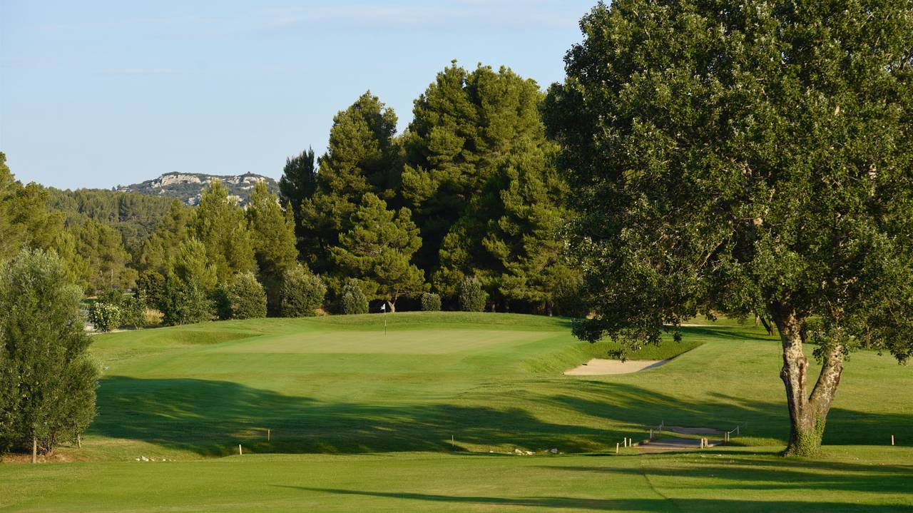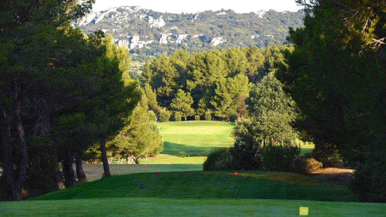 Ingebed in de rotsachtige omgeving van Les Baux. De baan maakt deel uit van het landschap en is omringd door dennen, eiken en olijfbomen. De uitzichten op de Alpilles zijn werkelijk prachtig.