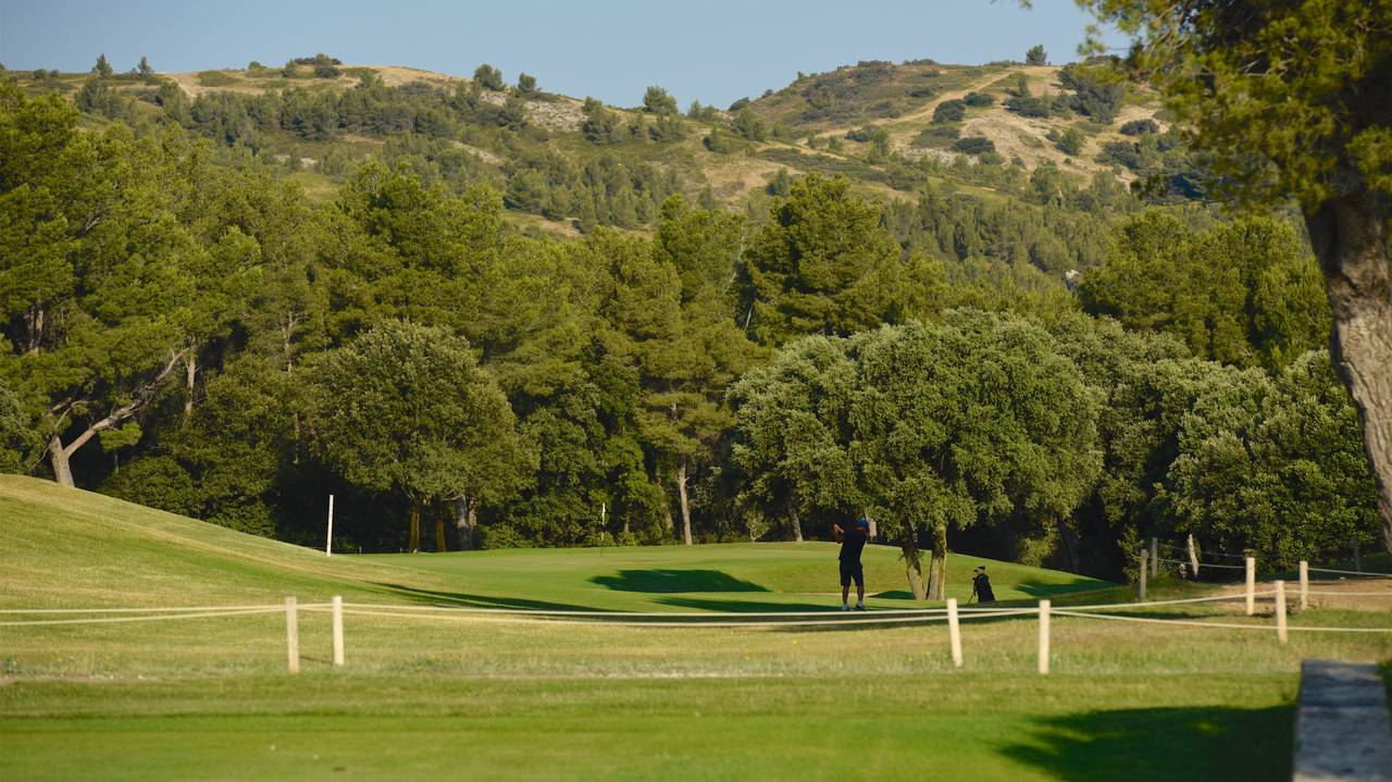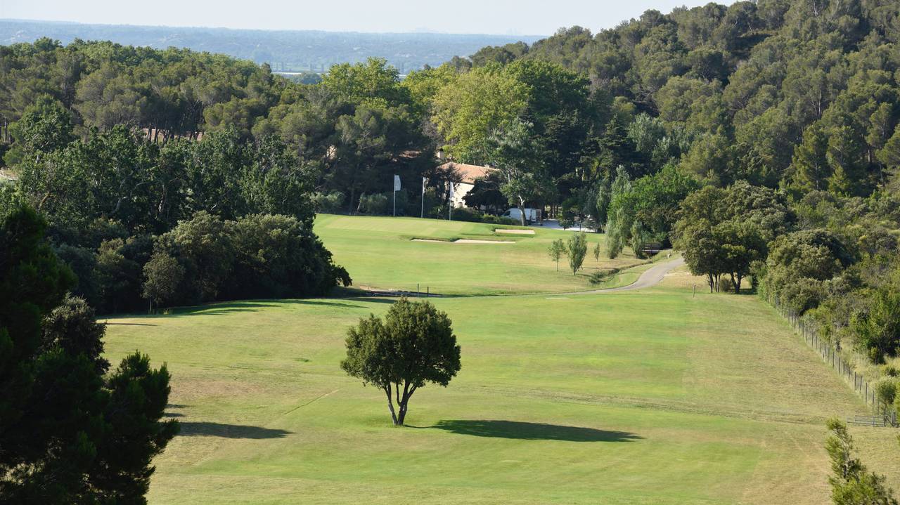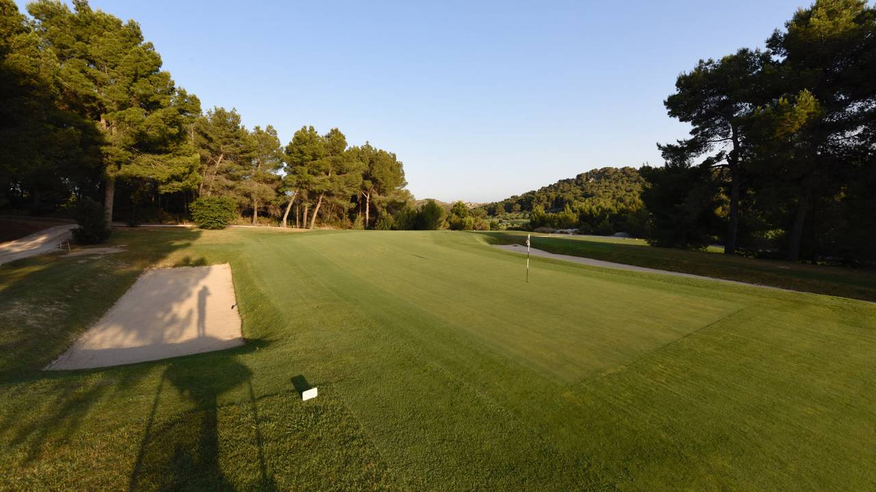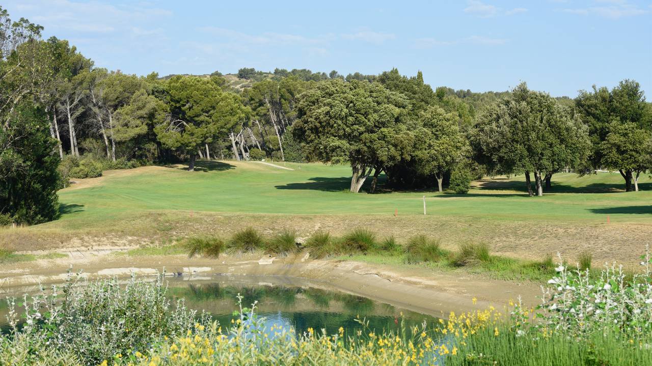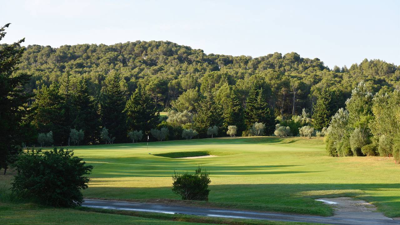 Ingebed in de rotsachtige omgeving van Les Baux. De baan maakt deel uit van het landschap en is omringd door dennen, eiken en olijfbomen. De uitzichten op de Alpilles zijn werkelijk prachtig.