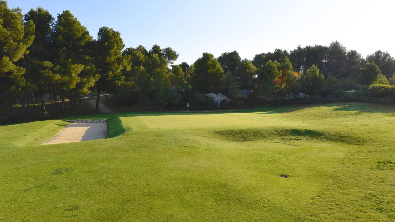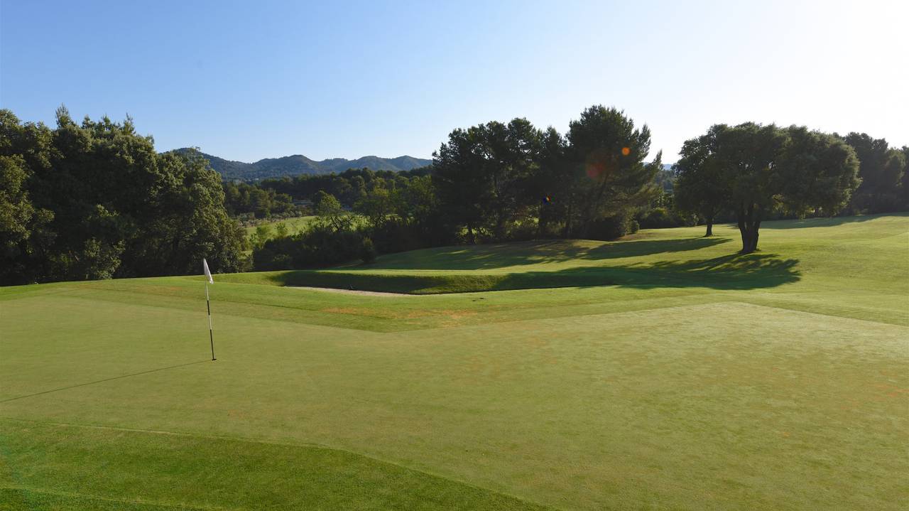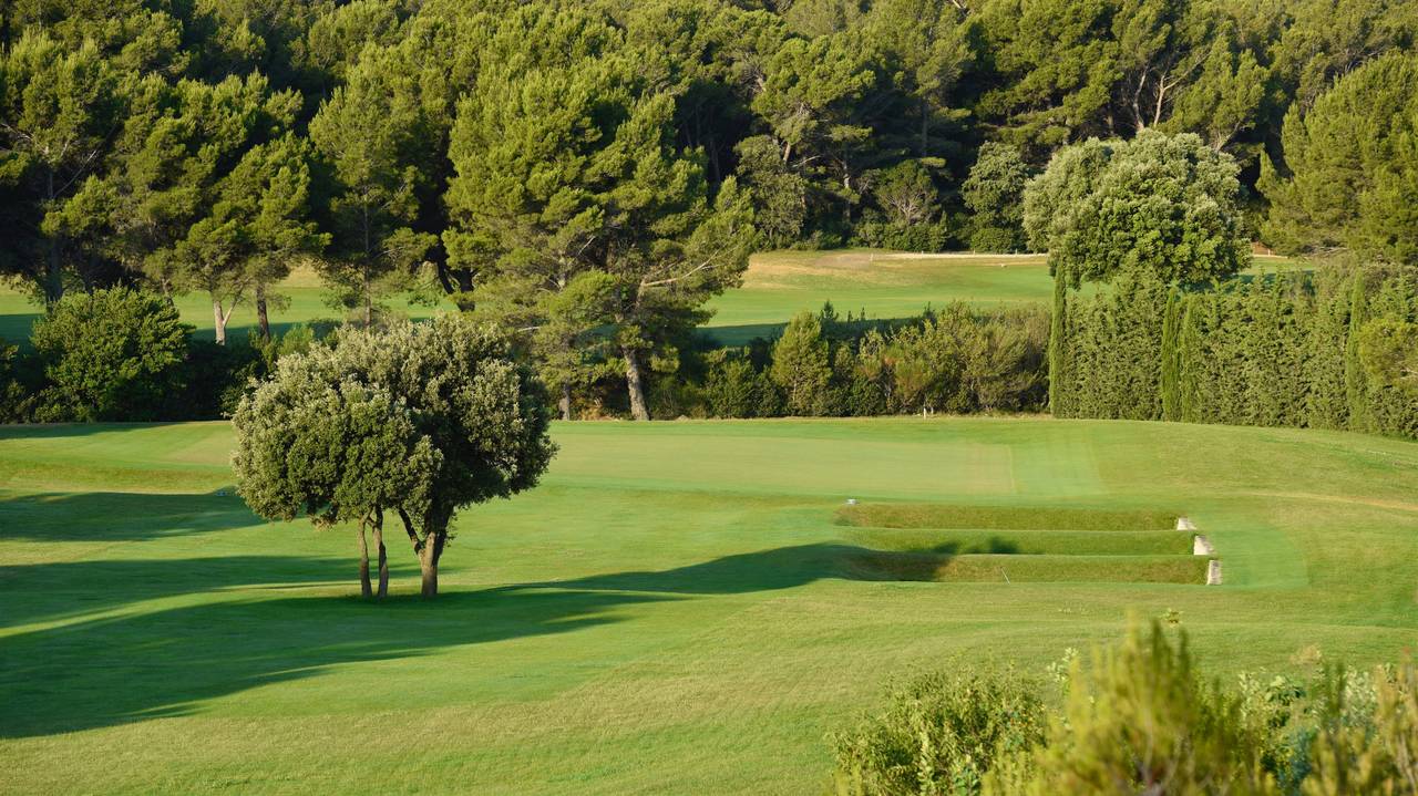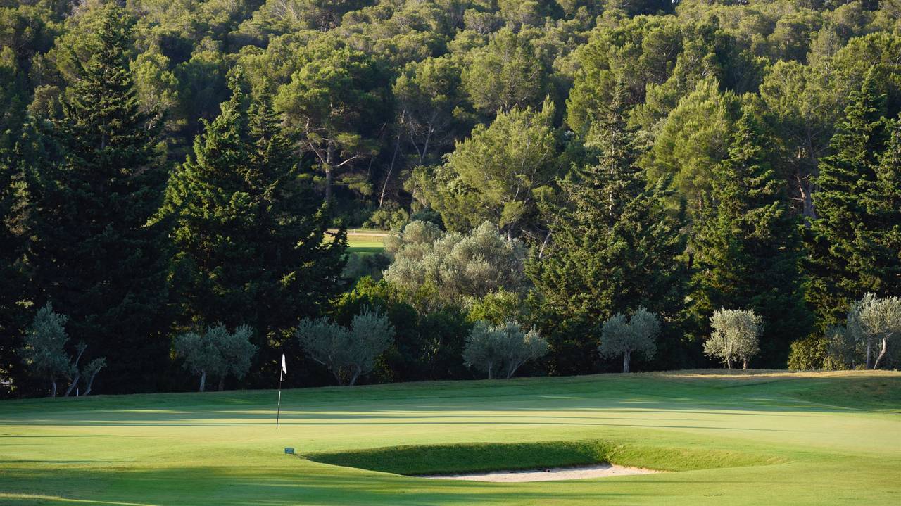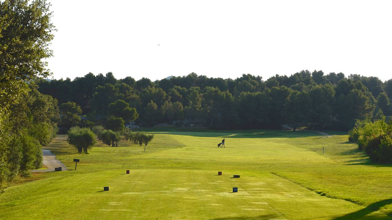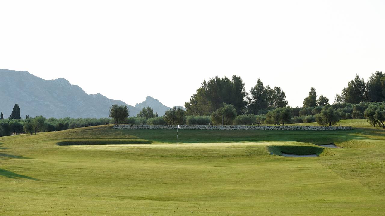 Ingebed in de rotsachtige omgeving van Les Baux. De baan maakt deel uit van het landschap en is omringd door dennen, eiken en olijfbomen. De uitzichten op de Alpilles zijn werkelijk prachtig.