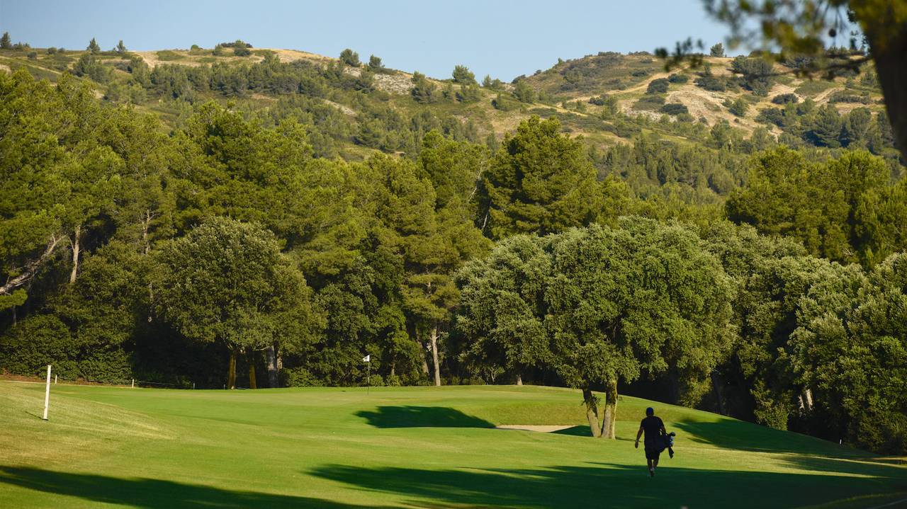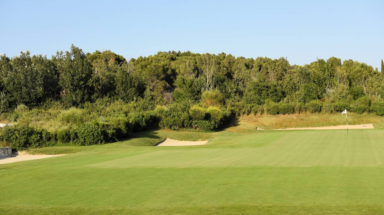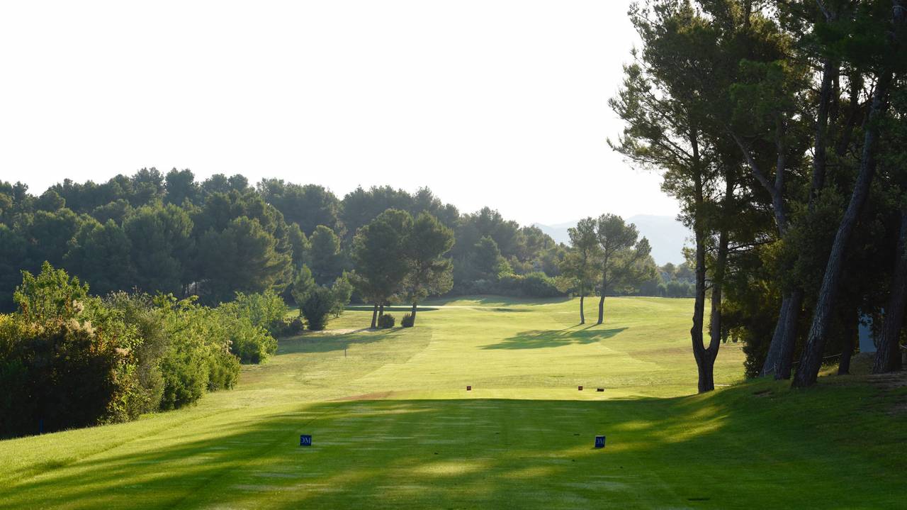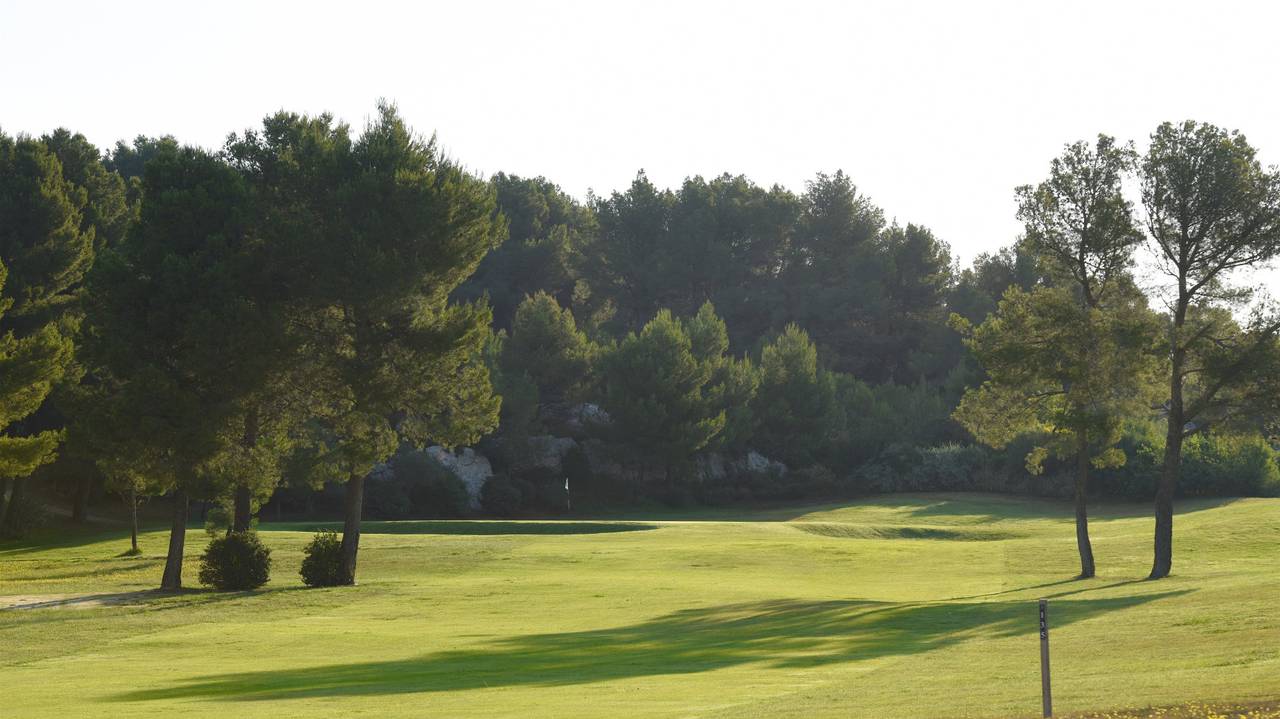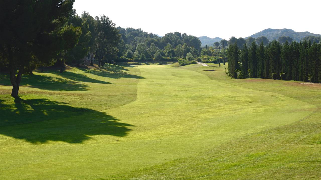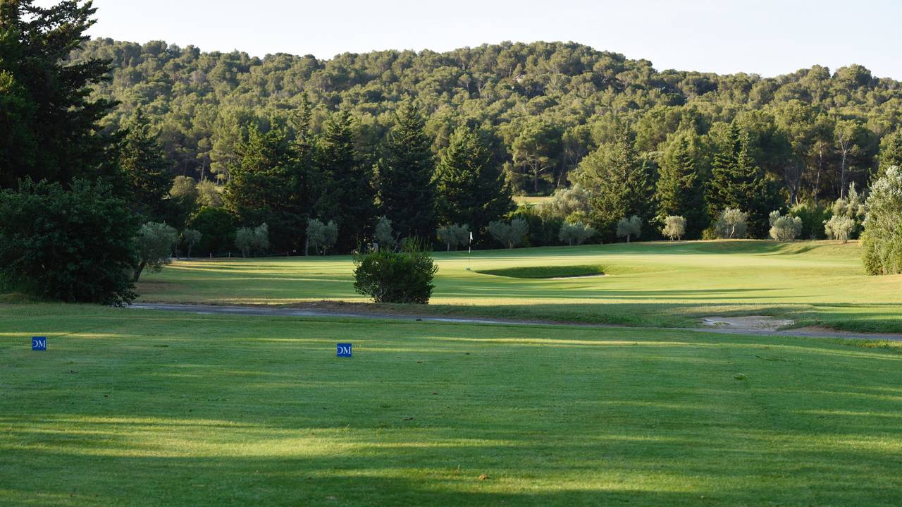 Ingebed in de rotsachtige omgeving van Les Baux. De baan maakt deel uit van het landschap en is omringd door dennen, eiken en olijfbomen. De uitzichten op de Alpilles zijn werkelijk prachtig.