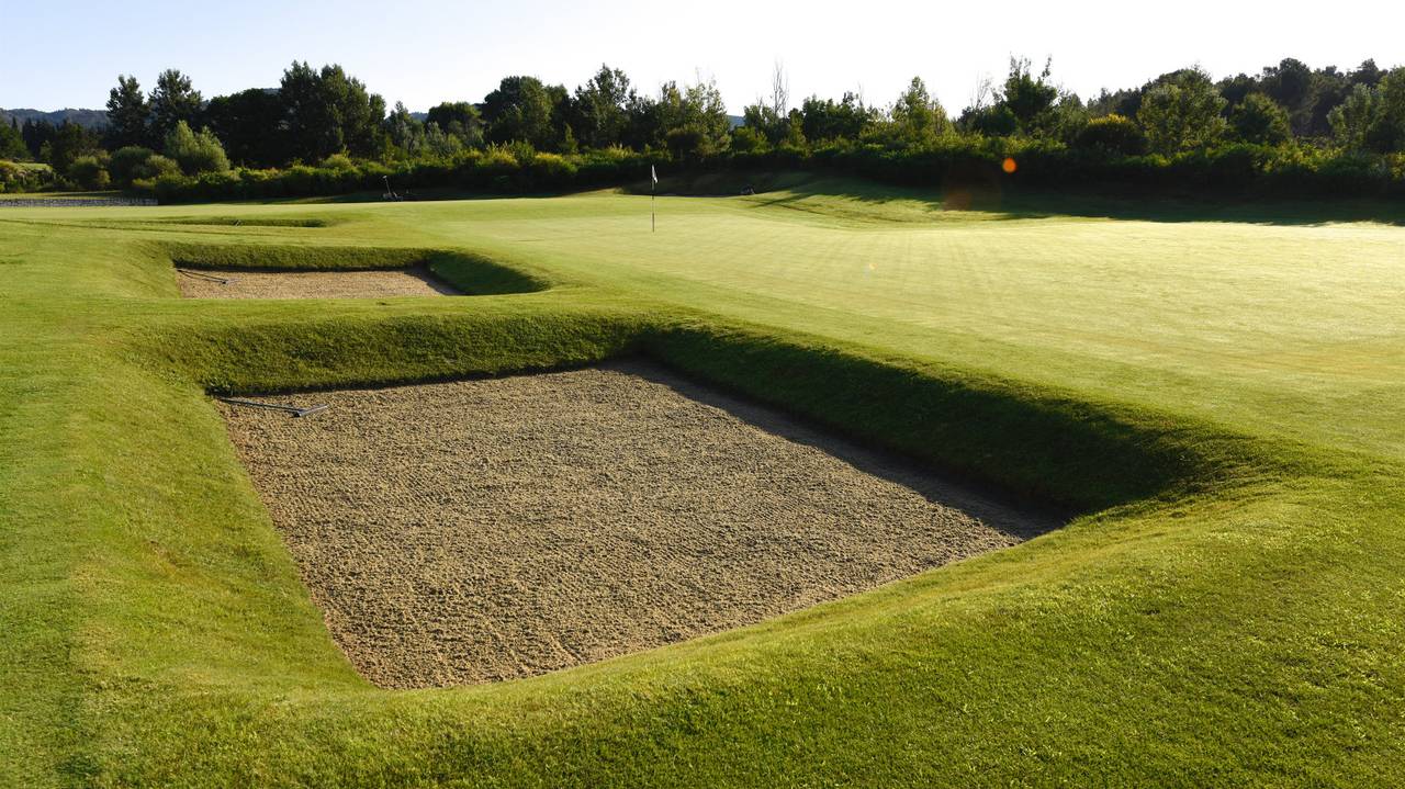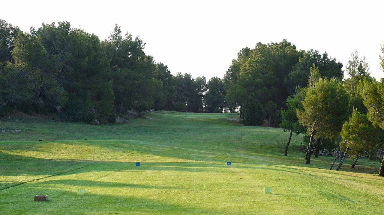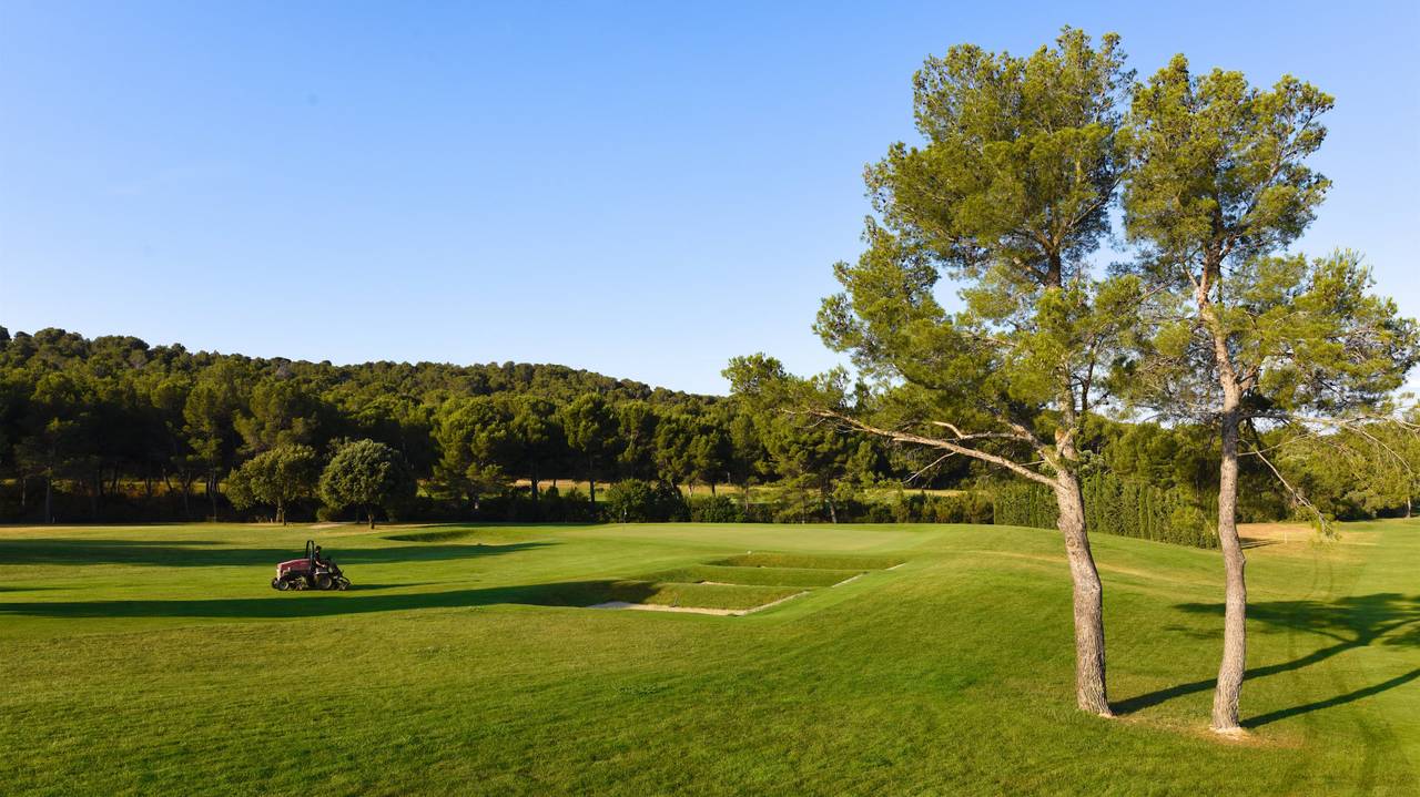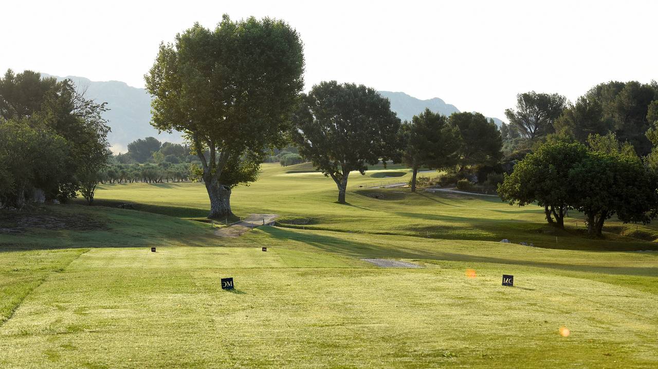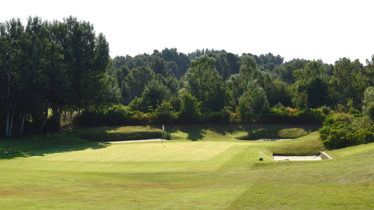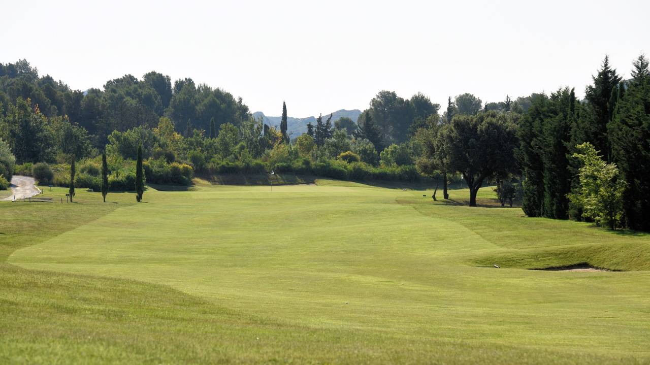 Ingebed in de rotsachtige omgeving van Les Baux. De baan maakt deel uit van het landschap en is omringd door dennen, eiken en olijfbomen. De uitzichten op de Alpilles zijn werkelijk prachtig.