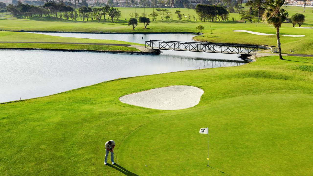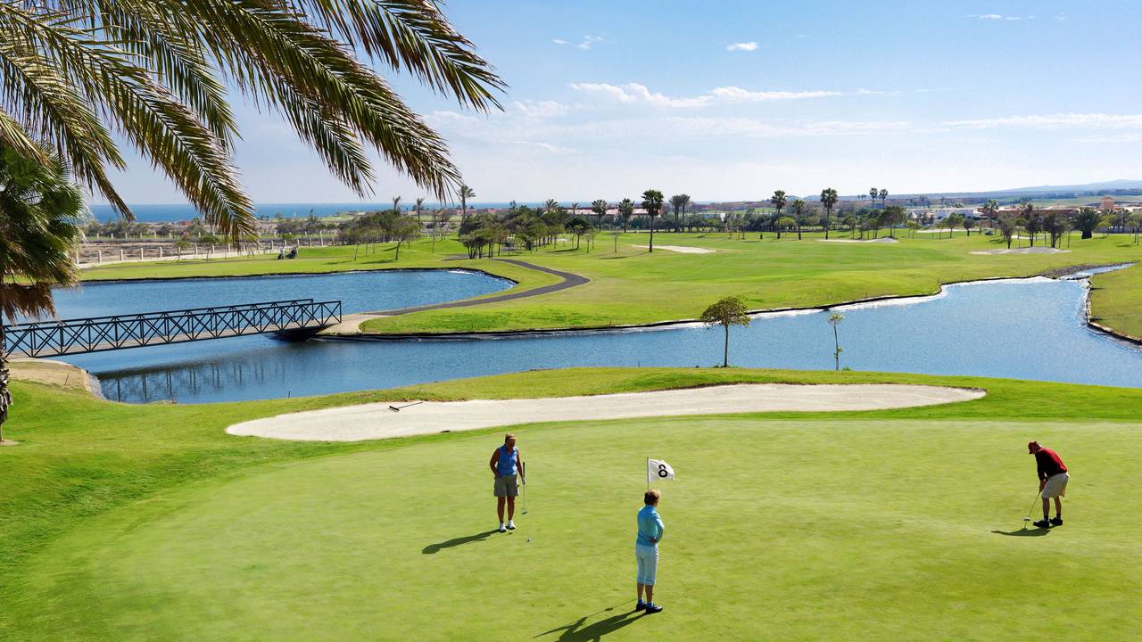 The 18-hole course has a par of 70 and a total distance of 6,069 metres. It has three lakes with a river meandering between them. The 17th is a par-5 which climbs to a raised green, while the 18th is a par-4 dogleg which drops down towards the clubhouse. The rest of the course is relatively flat. The facilities include a practice course with 50 tee positions, an enormous putting green, another green for practising approach shots and escapes from bunkers, and an extensive network of paths for the buggies. Classes are taught in various languages. The services also include a large, well stocked golf shop, changing rooms with lockers, and the possibility of hiring carts, buggies and two kinds of clubs. There are also bars, cafeterias, restaurants, terrace gardens, and all with 5-star service.