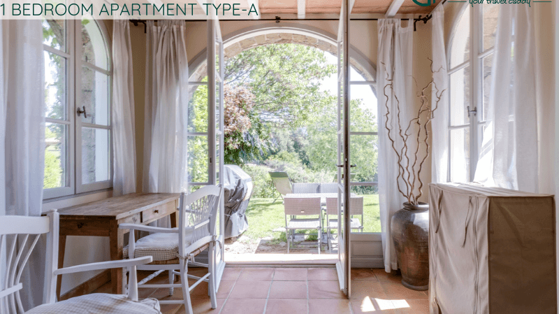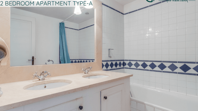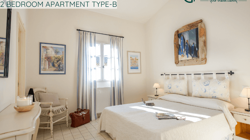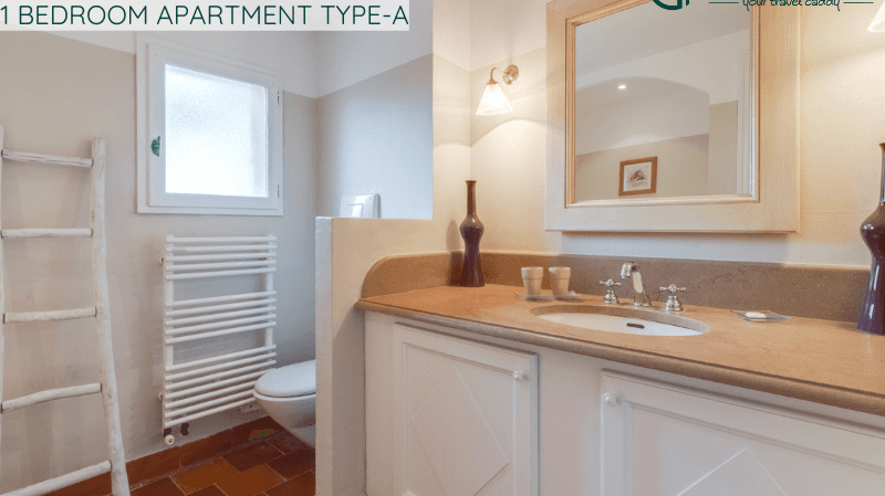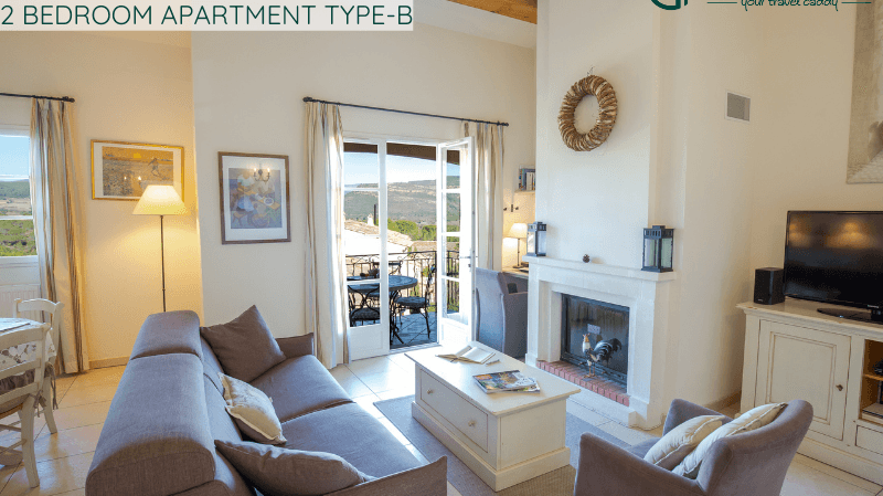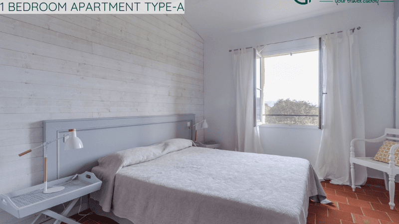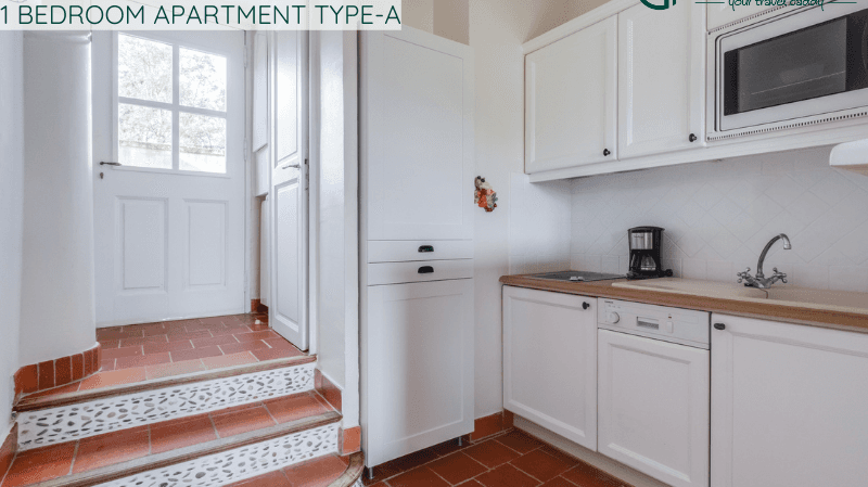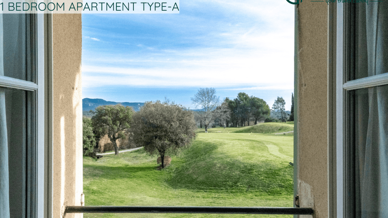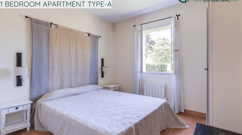 Appartement met 1 slaapkamer type A: 45 m² in 1 of 2 verdiepingen, maximaal 2 personen, comfortabel en aangenaam ingericht: entree, wc, woon/eetkamer met tv, volledig ingerichte keuken met vaatwasser, koelkast/vriezer, magnetron, 2 kookplaten, waterkoker, filterkoffiezetapparaat, broodrooster. Eerste verdieping: 1 tweepersoonsslaapkamer met TV, 1 badkamer, wc. Buiten: terras, tuinmeubilair (tafel en stoelen). Slaapkamer met airconditioning. Parkeerplaats vlakbij het appartement. Dit appartement ligt vlakbij het restaurant en de golfreceptie. Gedeeld zwembad (van mei tot oktober)