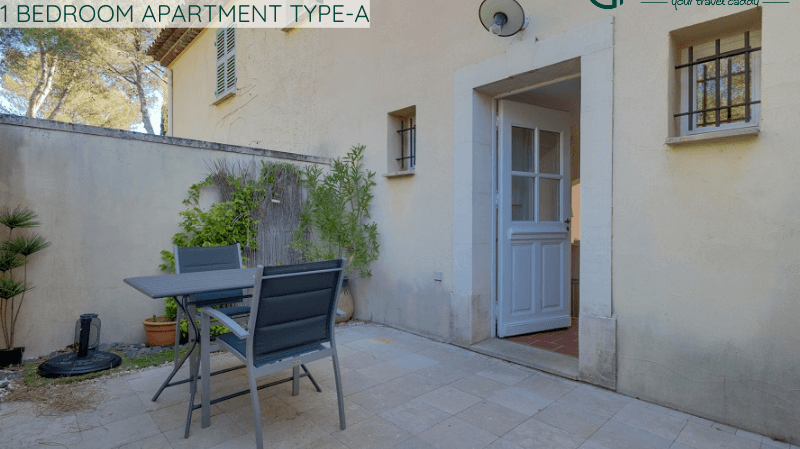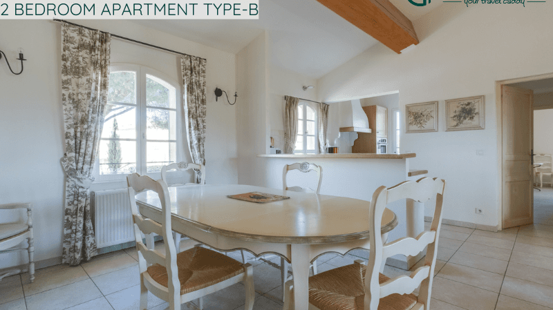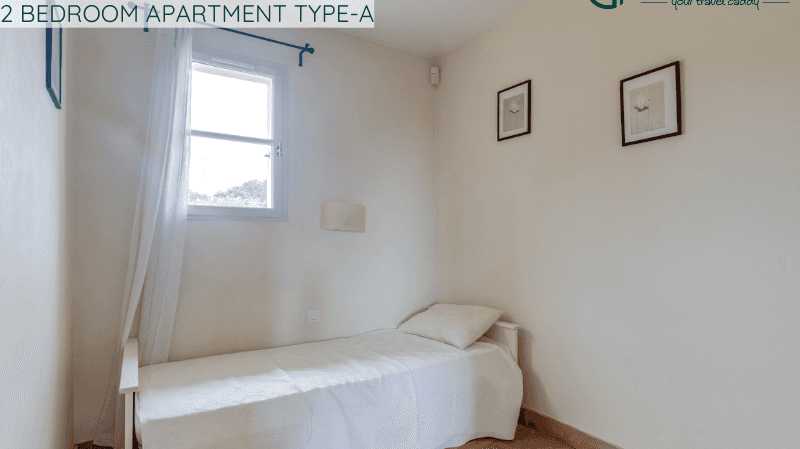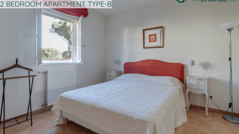Appartement met 2 slaapkamers type A : 50 m² in 1 niveau, maximaal 2 volwassenen en 2 kinderen, comfortabel en aangenaam ingericht: woon/eetkamer met TV, volledig ingerichte keuken met vaatwasser, koelkast/vriezer, magnetron, 2 kookplaten, waterkoker, filterkoffiezetapparaat, broodrooster. 1 slaapkamer met tweepersoonsbed, 1 slaapkamer met 2 kleine bedden (onderschuifbed), 1 badkamer. Slaapkamer met airconditioning. Wasmachine. Balkon of terras, tuinmeubilair (tafel en stoelen). Parkeerplaats in de buurt van het appartement. Gedeeld zwembad (van mei tot oktober)