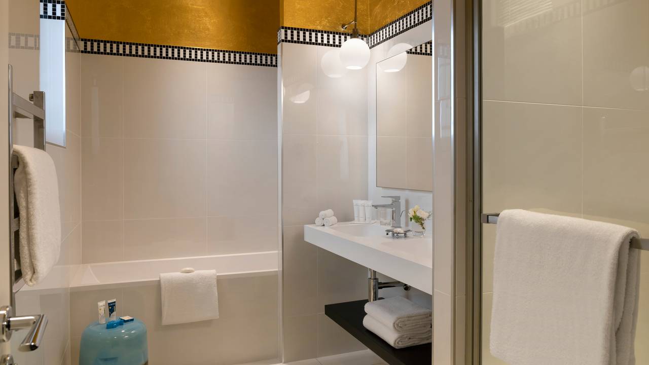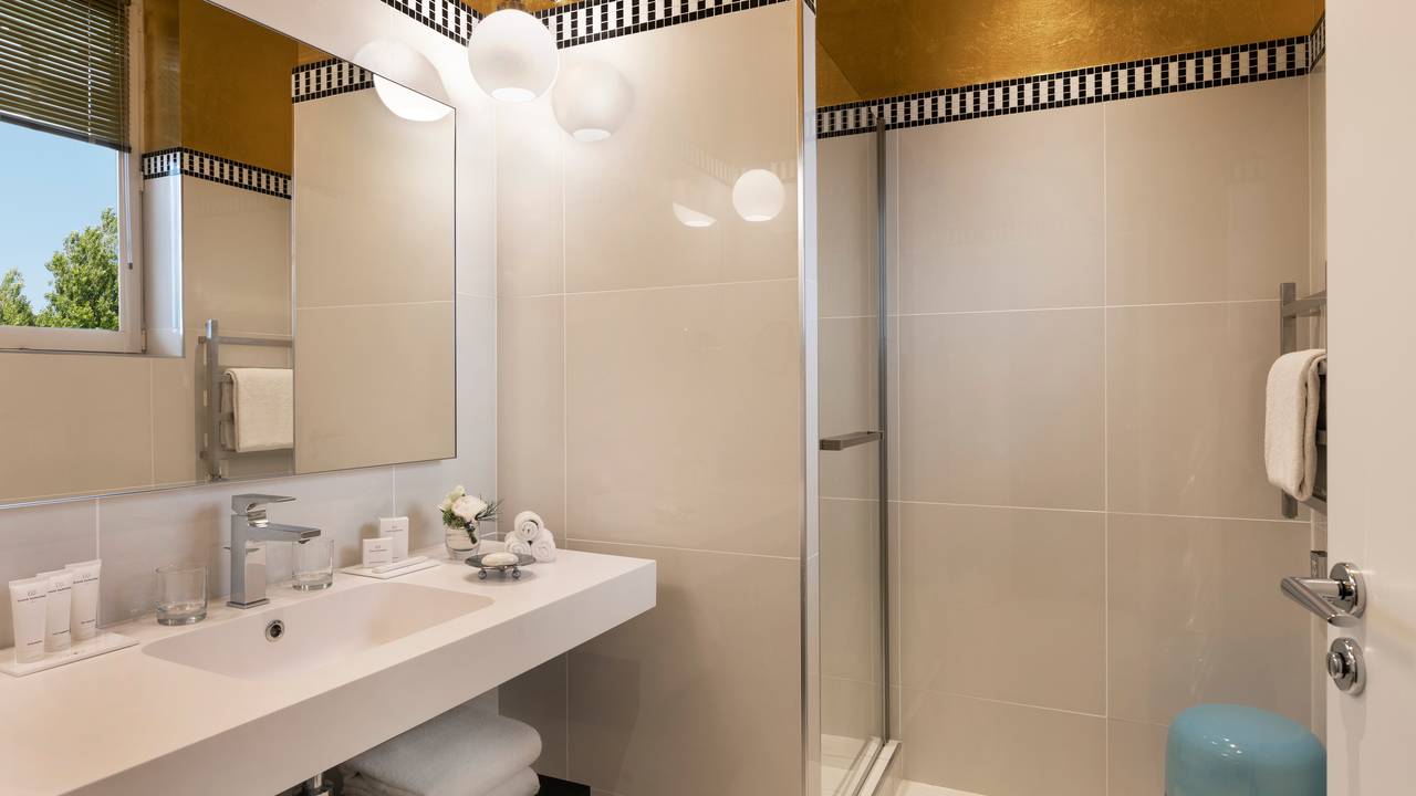 2-pers. kamer: klassiek modern ingericht met bureau, zithoek en voorzien van telefoon, sat.-tv, wifi, badjassen, minibar, kluisje, badjassen en airco. Badkamer met bad/douche, toilet en föhn.