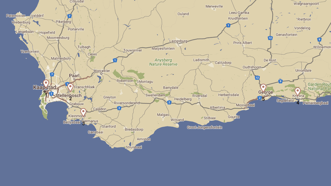 Op de laatste dag rijdt u vanaf George naar Kaapstad. Dit is een vrij lange reis van ca. 450km. Neem rustig de tijd voor deze rit want uw vlucht vertrekt pas op dag 14 rond 01:00 uur. Lunch nog ergens aan het strand, bezoek nog wat leuke winkels of een wijnhuis.