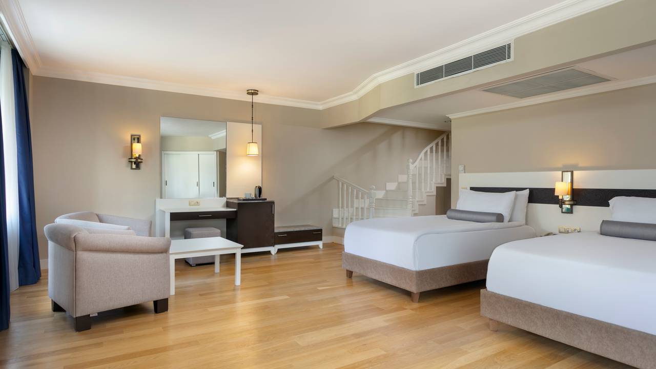 De 436 kamers die Sirene Belek Hotel telt zijn modern ingericht en zeer ruim met zitgedeelte en voorzien van telefoon, sat.-tv, wifi, minibar, kluisje en airco. Badkamer met douche/bad, toilet, föhn, badjassen en badslippers. Groot balkon met zitje. Een aantal kamers heeft zelfs een aparte woonkamer.