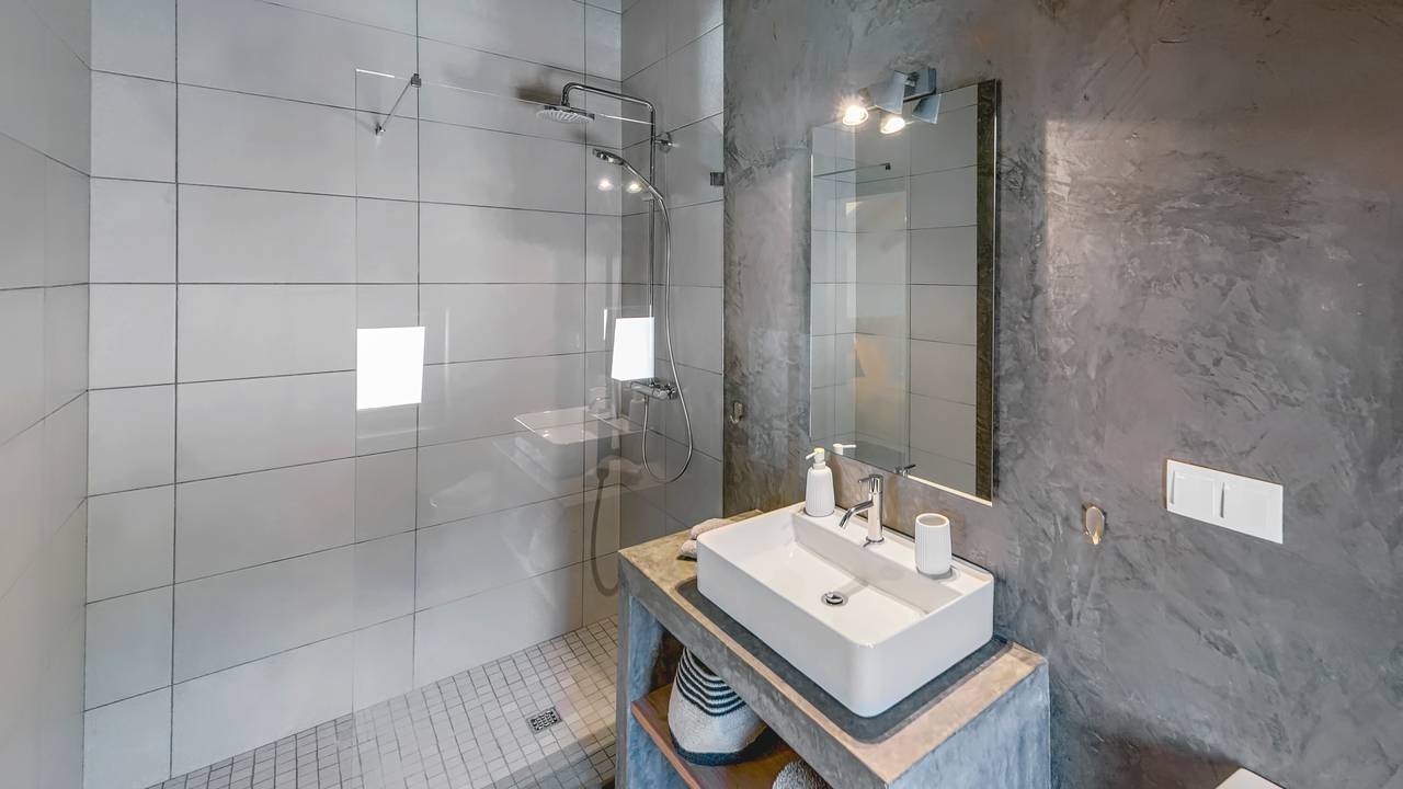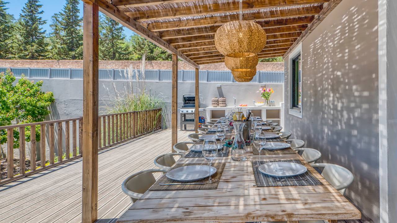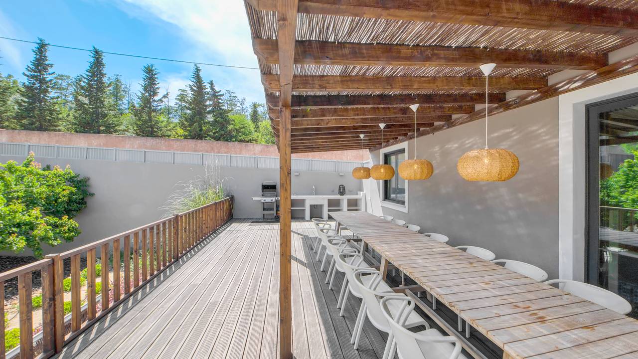 Faciliteiten: luxe villa met een woonoppervlakte van 220 m2 met 8 slaapkamers en een grote tuin met terras en onverwarmd zwembad. Elke slaapkamer heeft een eigen badkamer met douche, toilet en wastafel. Ruime woonkamer met grote loungebank, vide met tv-hoek. Wasmachine, droger en keuken met 2 koelkasten, wijnkoelkast, vaatwasser en inductie kookplaat.