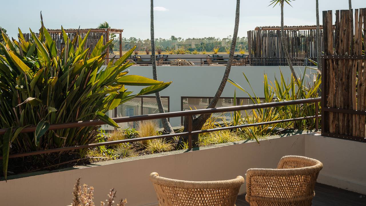 Bovenaan de vleugel van het hotel ligt de outdoor wellnessruimte. Deze is zorgvuldig ontworpen om een holistische trainingservaring te bieden, met een meer natuurlijke en organische benadering van lichaamsbeweging. Hier vind je geen traditionele machines, maar een selectie fitnessapparaten die functionele bewegingen en wellness voor het hele lichaam stimuleren.